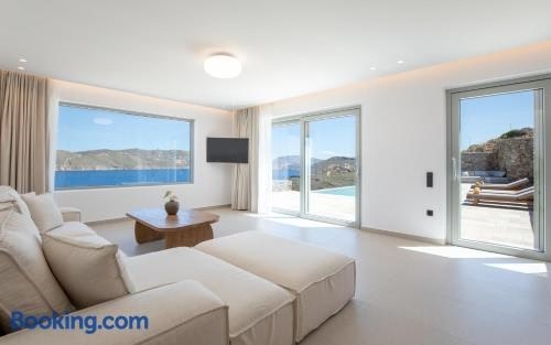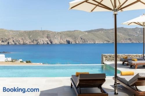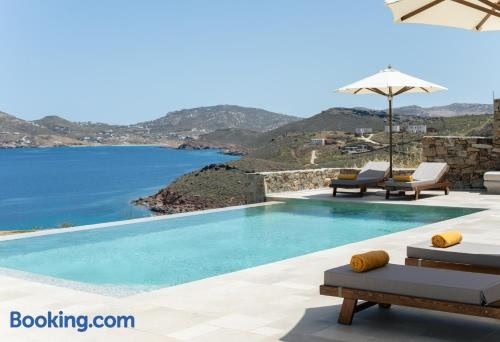 Die Unterkunft Villa Sozon Mykonos, die über einen saisonalen Außenpool, einen Garten und eine Terrasse verfügt, bietet Übernachtungsmöglichkeiten in Agios Sostis Mykonos mit kostenlosem WLAN und Meerblick.