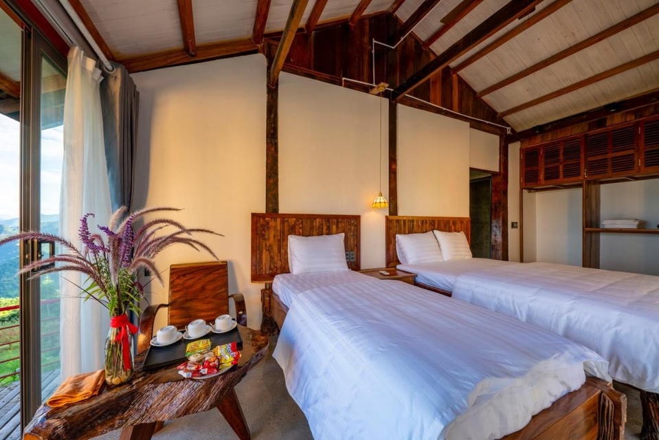 Die Unterkunft SIM Farmstay, die in Ha Giang gelegen ist, bietet Bergblick sowie ein Restaurant, eine Gemeinschaftsküche, eine Bar, einen Garten, einen Außenpool und eine Terrasse.