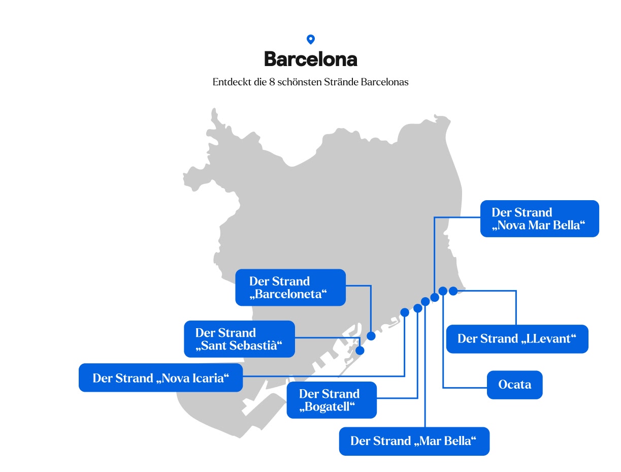 Mit seiner perfekten Kombination aus Sehenswürdigkeiten, Kultur und Stränden darf Barcelona auf keiner Must-see-Liste fehlen. Es gibt so viele Strände, dass ihr wissen solltet, wie ihr eure Zeit verbringen möchtet, bevor ihr euch für einen entscheidet. Es gibt pulsierende Strände wie den beliebten La Barceloneta oder ruhige Playas wie den etwas weiter entfernten Strand Ocata. Alle Strände der katalanischen Hauptstadt sind mit hervorragenden Einrichtungen ausgestattet und viele von ihnen wurden für Personen mit eingeschränkter Mobilität modernisiert und barrierefrei gemacht. Ihr könnt die meisten einfach mit der Metro oder dem Zug erreichen.